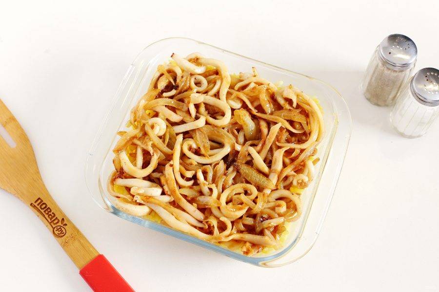 Форму для запекания смажьте маслом. Выложите отваренный ранее рис, а на него выложите лук и кальмары.