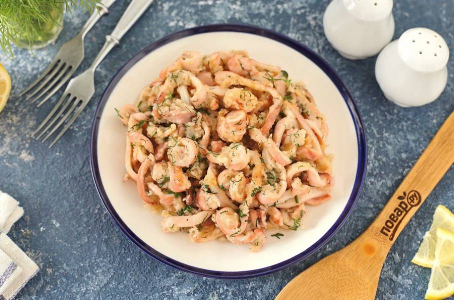 Все перемешайте и снимите с огня. Кальмары с лимоном готовы. Приятного аппетита!