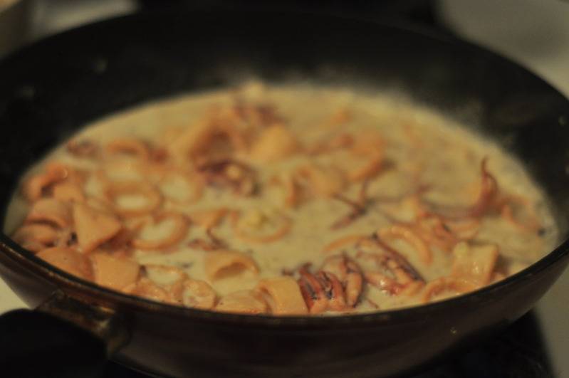 Добавляем кальмары, и жарим всё вместе около 5 минут на медленном огне.