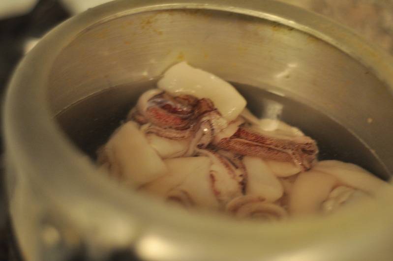 Кальмары режем на небольшие кусочки. Опускаем их в кипящую соленую воду буквально на 2-3 минуты.