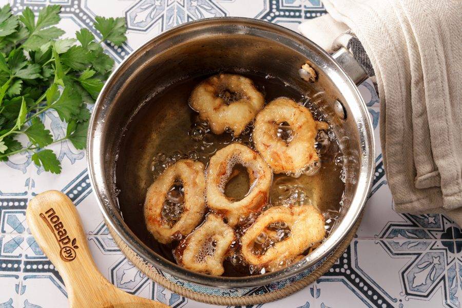 Жарьте 2-3 минуты до золотистого цвета. Выкладывайте готовые кольца на бумажную салфетку, чтобы удалить излишки масла.