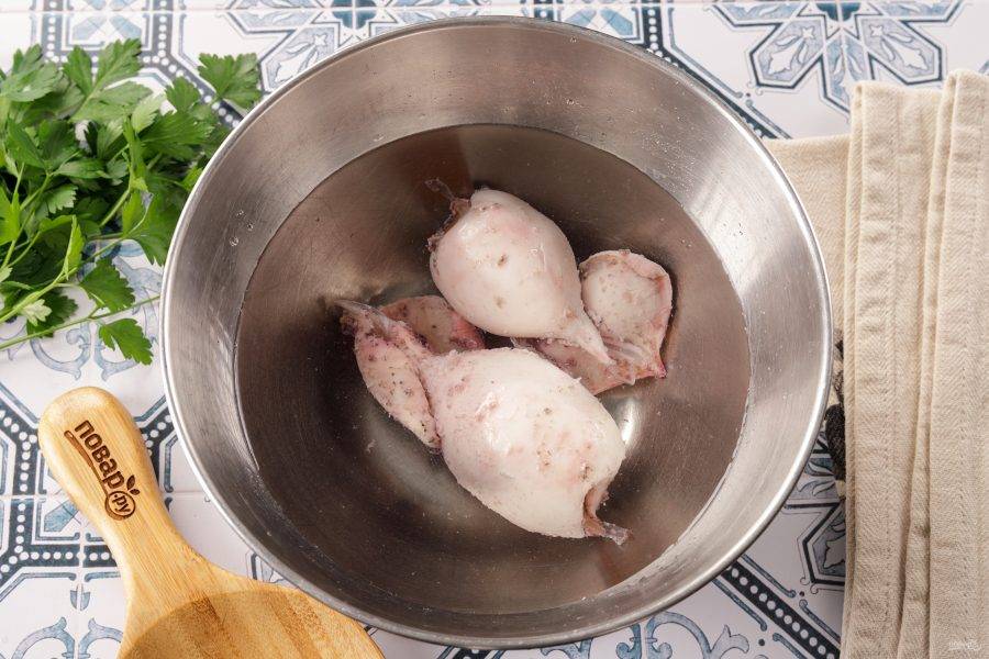 Затем переложите тушки кальмаров в ледяную воду. Промойте под проточной водой, очистите от кожуры и тонкой прозрачной пленки, удалите внутренности.