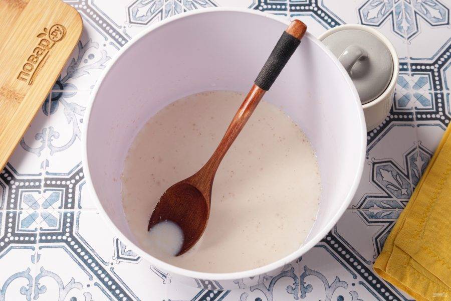 Соедините тёплое молоко, сахар и дрожжи. Дайте постоять 10 минут.