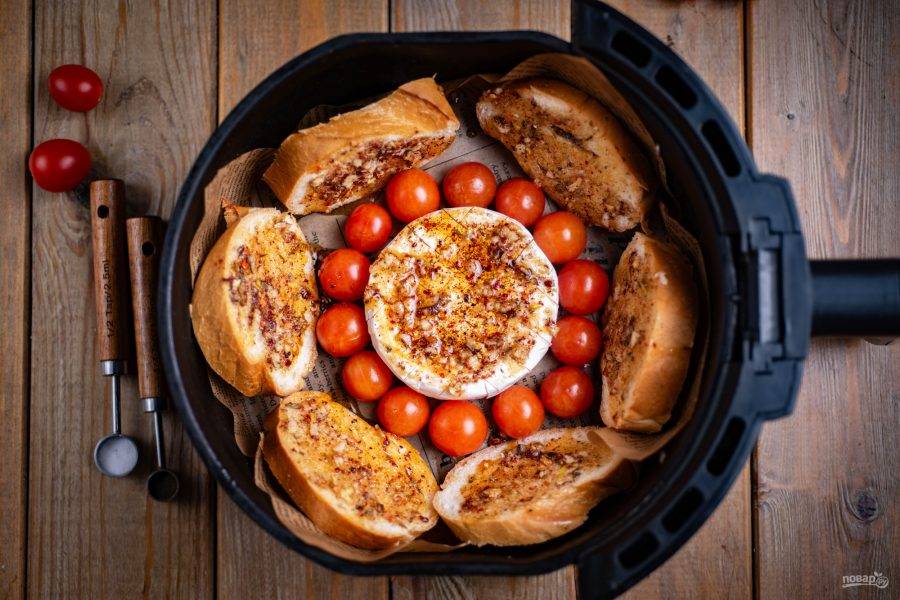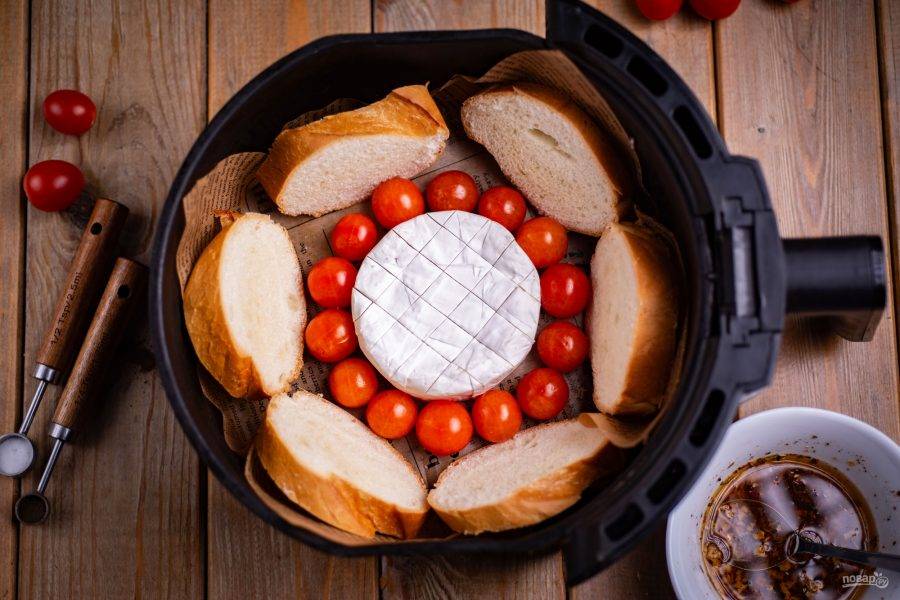 На решетку чаши аэрогриля застелите пергамент для выпекания, выложите на центр камамбер, по кругу разложите помидорки черри, также разложите и ломтики багета.