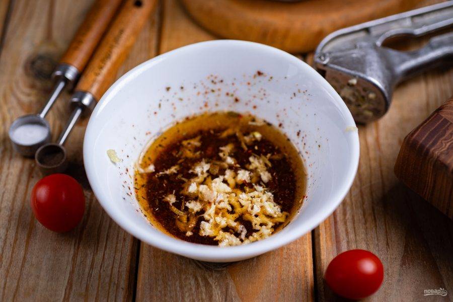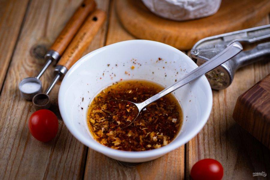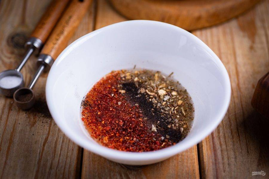 В мисочку залейте оливковое масло, добавьте паприку, прованские травы, черный молотый перец, соль. Перемешайте.