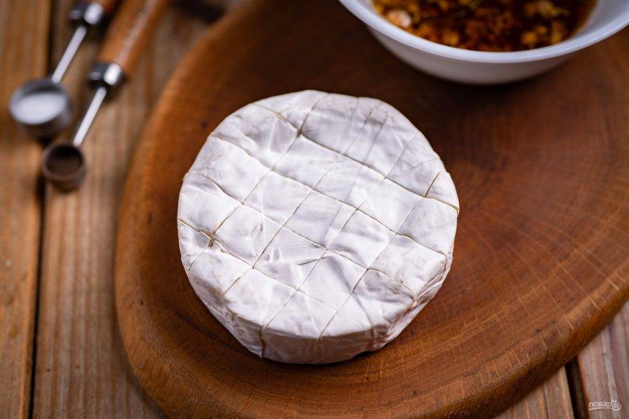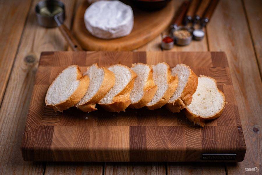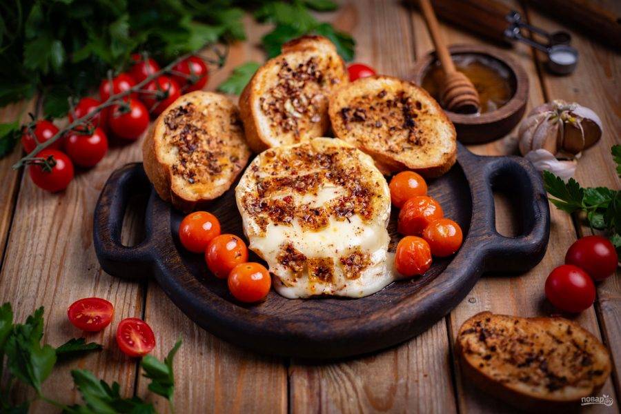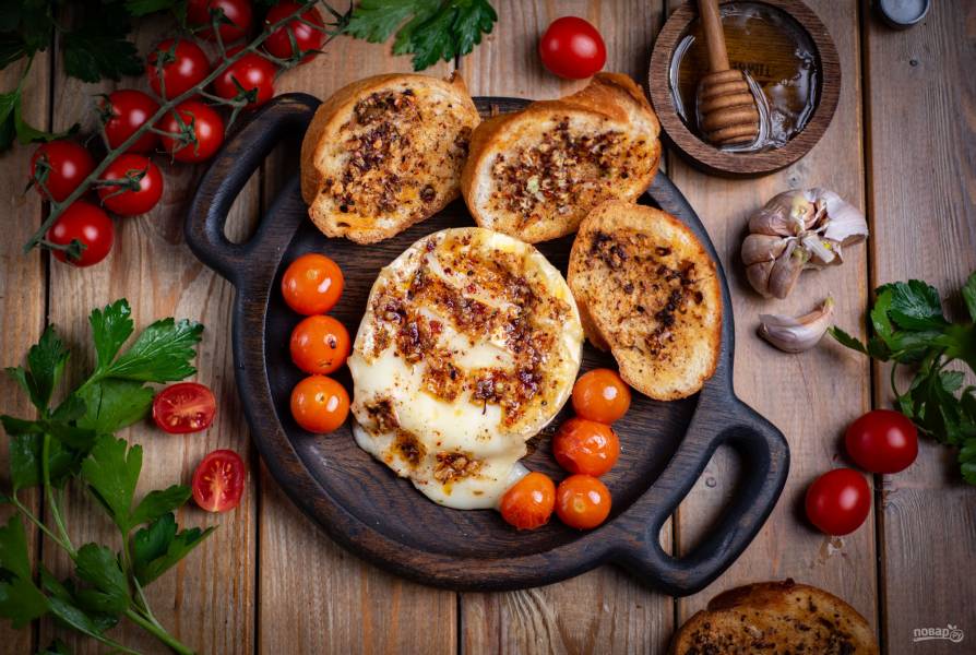 Готовый камамбер аккуратно переложите на блюдо для подачи, выложите к нему пару ломтиков запеченного багета и помидорки черри.