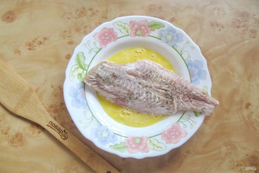 Обмакните камбалу в яйцо со всех сторон.