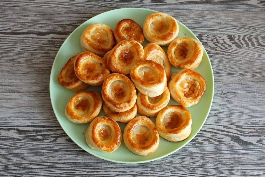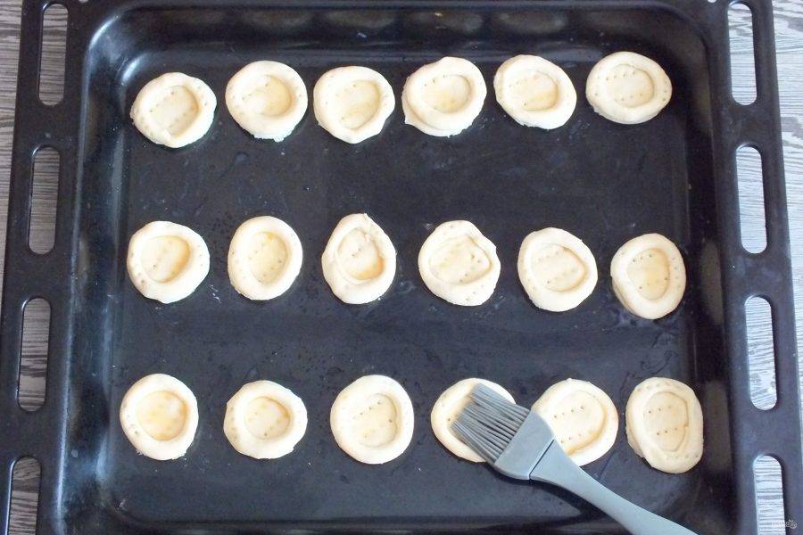 Каждую заготовку смажьте взбитым яйцом. Поставьте выпекаться в разогретую до 180 градусов духовку на 20 минут. Учитывайте особенности своей духовки.