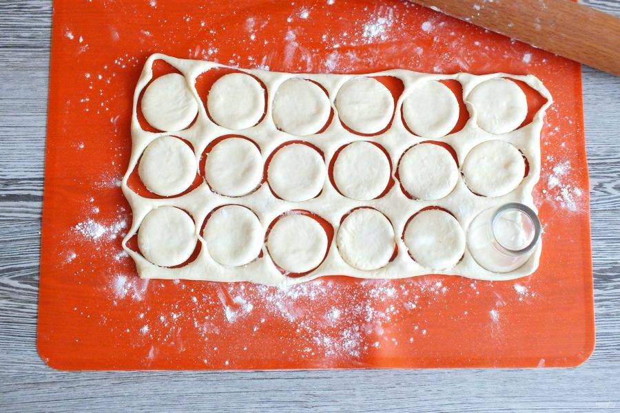 Вырежьте круглой формочкой (диаметром 5 см.) заготовки. У меня получилось 18 штук.