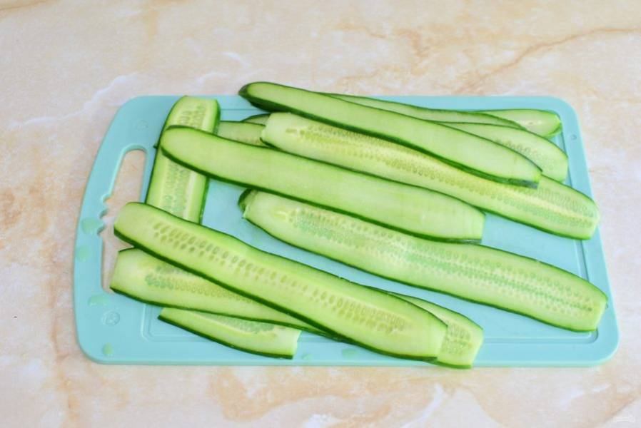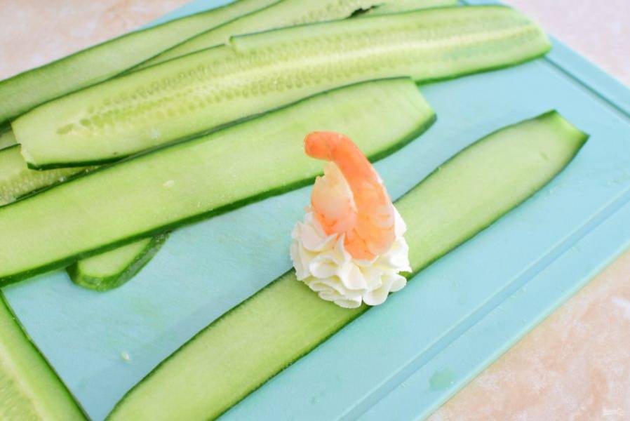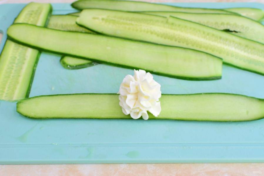 Разложите ломтик огурца и на середину выложите творожный сыр. Можно в сыр добавить соль, специи, зелень, чеснок.