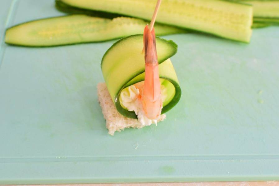 Сверните огурец. Поставьте на ломтик хлеба и проткните все шпажкой.