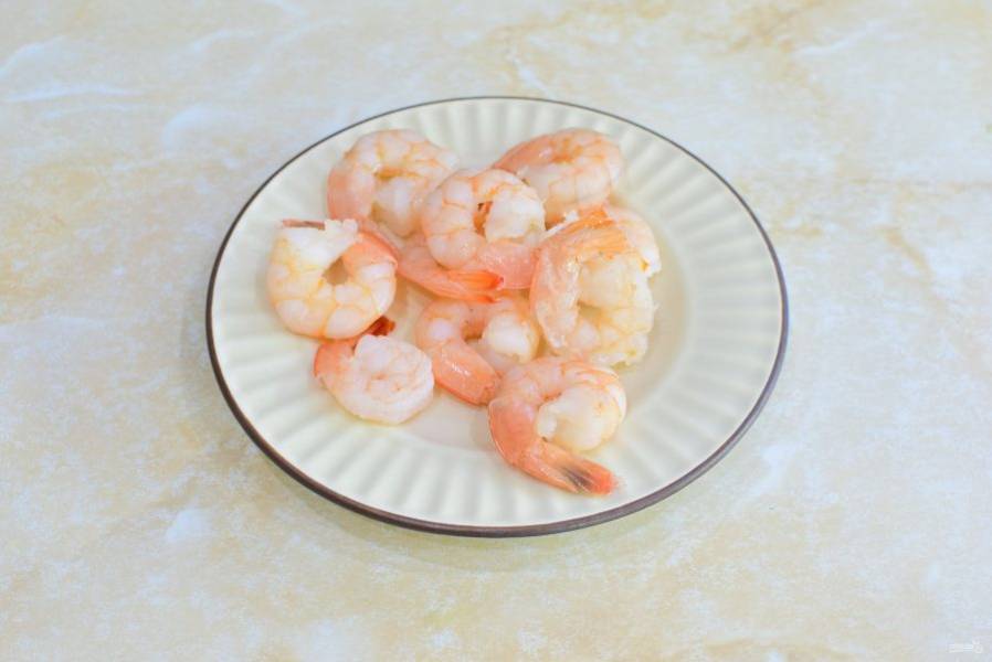 Креветки отварите 2-3 минуты в кипящей подсоленной воде. Затем остудите и очистите.