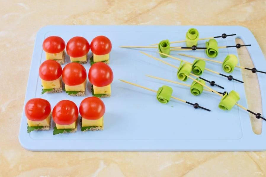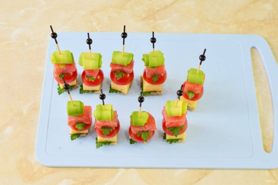 Переложите готовые канапе на блюдо и подавайте к столу.
