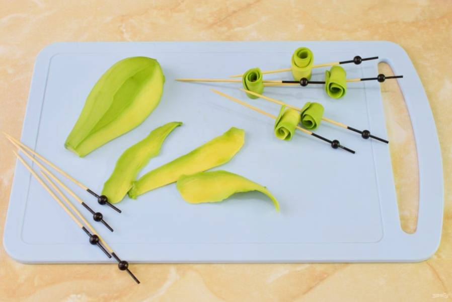 Авокадо очистите и нарежьте тонкими полосочками. Скрутите авокадо в рулетик и нанизайте на шпажку.