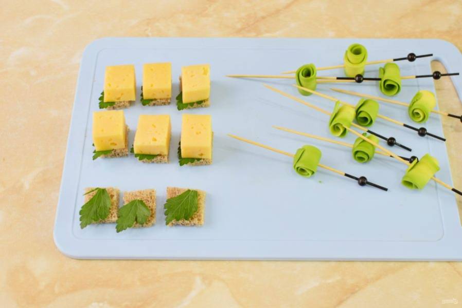 Хлеб нарежьте небольшими квадратиками. Выложите на него зелень и сыр.