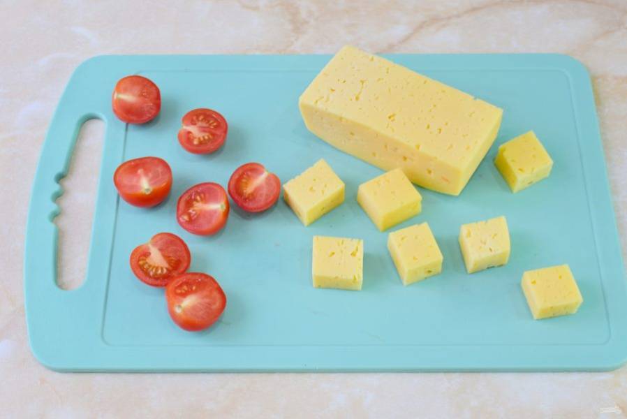 Помидоры черри разрежьте пополам. Сыр нарежьте кубиками.