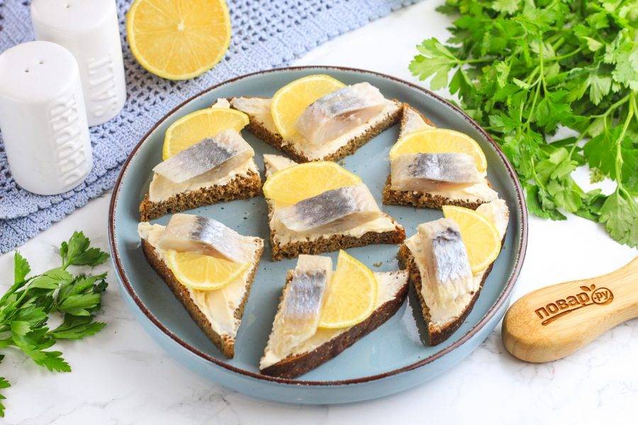Праздничное канапе с селедкой и лимоном отлично подойдет для любого банкета или фуршета. Готовится оно за считанные минуты, его даже можно сделать заранее и хранить в холодильнике до подачи!