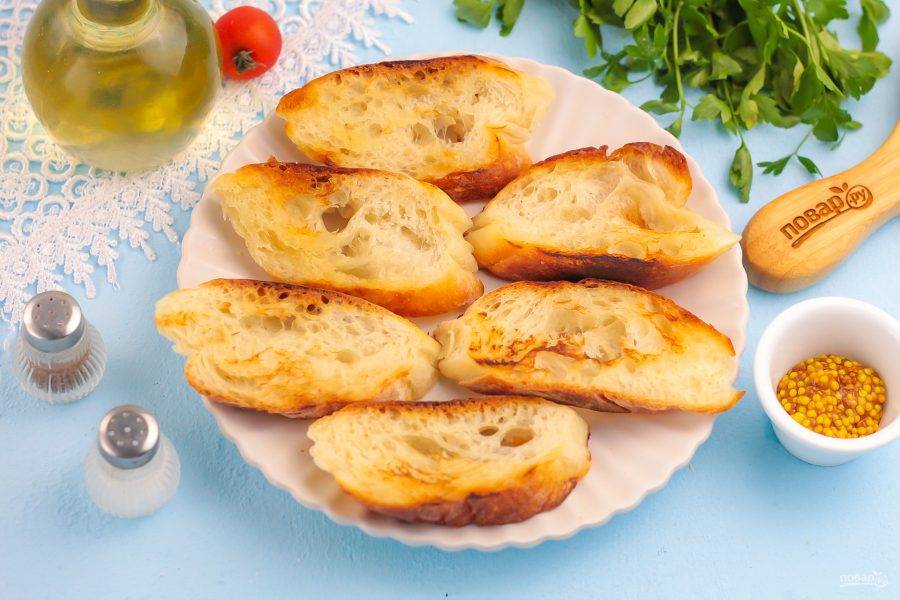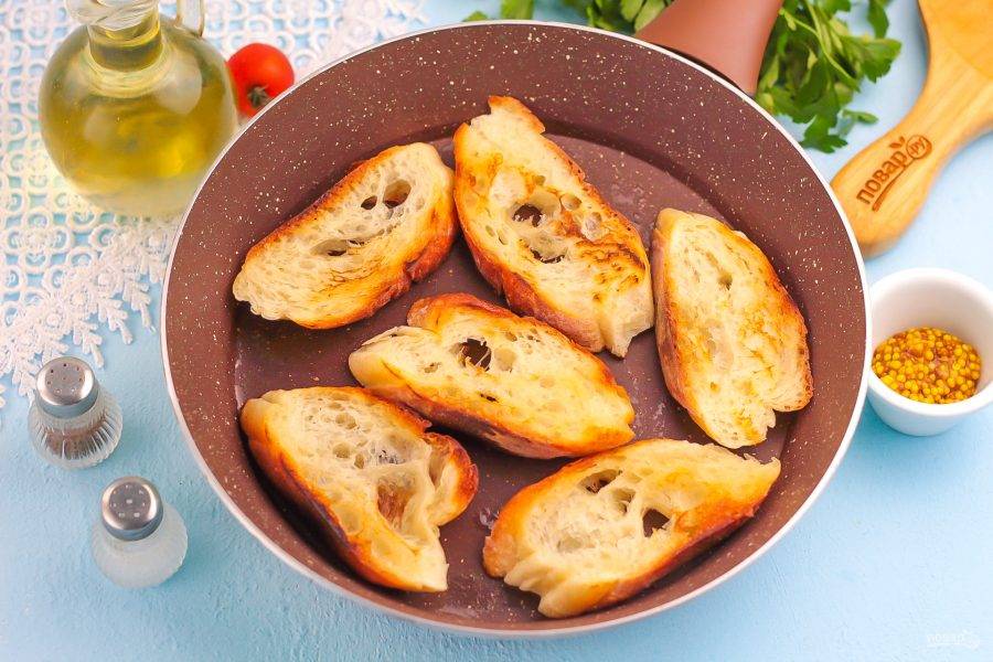 Нарежьте багет ломтиками и подрумяньте на сухой сковороде по 1-2 минуты с каждой стороны. Можно добавить на сковороду немного растительного масла.