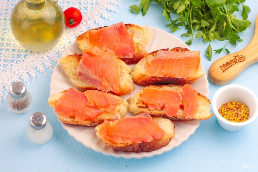 Нарежьте слабосоленую семгу ломтиками или приобретите уже готовую нарезку. Выложите ее на хлебную основу.