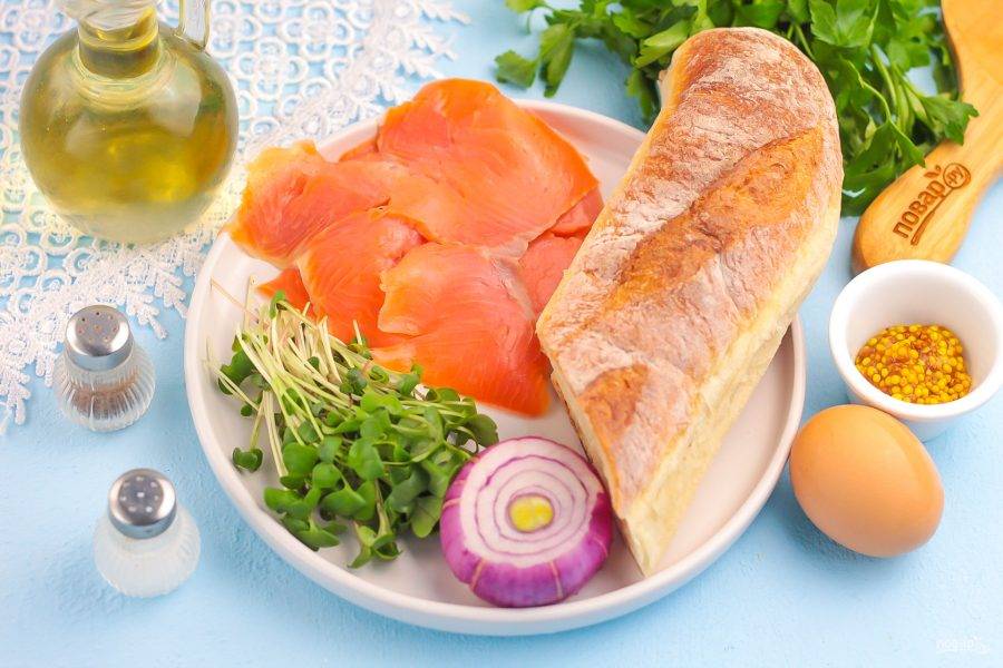 Подготовьте указанные продукты. Для основы можно использовать батон, багет или кирпичик. Семгу выбирайте слабосоленую.