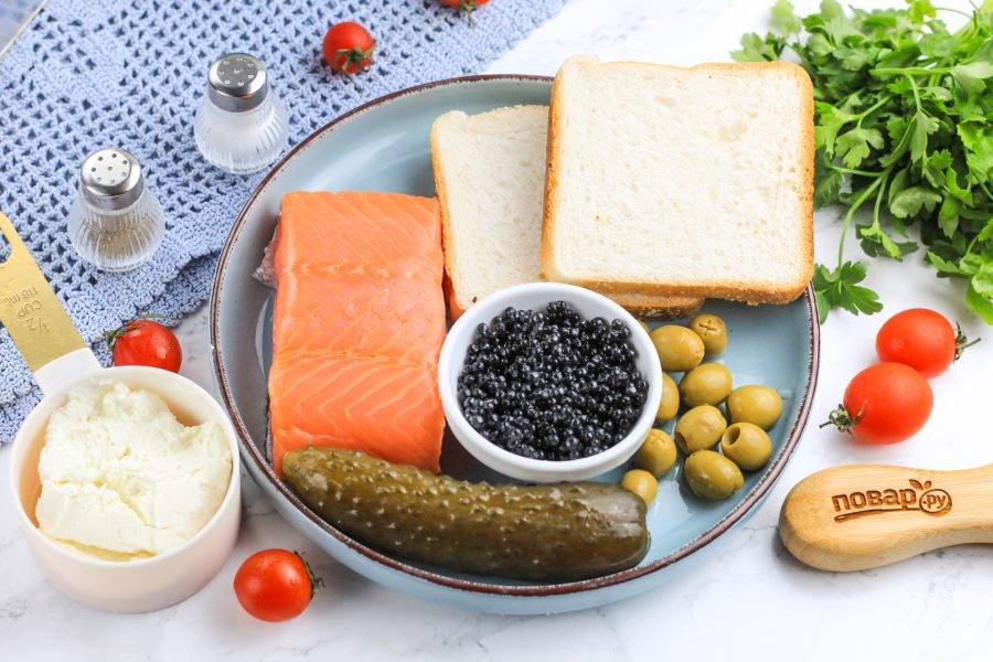 Подготовьте указанные ингредиенты. Соленый огурец можно заменить свежим, черную икру — красной или икрой трески.