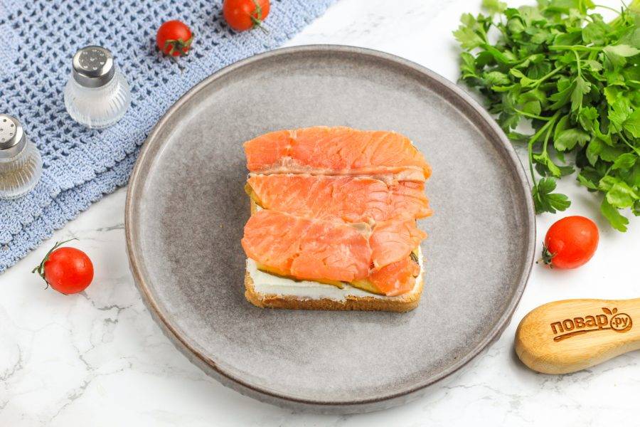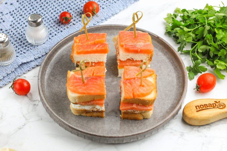 Обмажьте второй ломтик хлеба оставшимся сыром и выложите на него нарезанную семгу. Выложите хлеб на первый ломтик и вставьте шпажки, отступая от краев ломтика примерно 1 см.