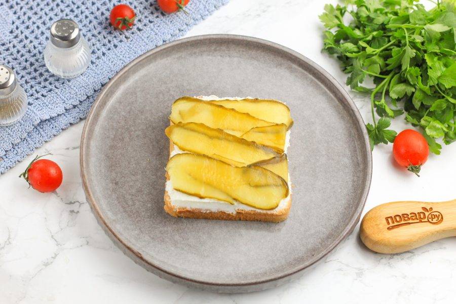 С помощью овощечистки нарежьте соленый огурец и выложите ленты на творожный сыр.