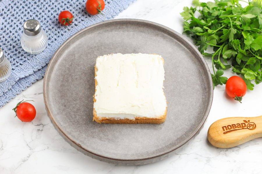 Ломтик хлеба смажьте половиной творожного сыра, стараясь сделать слой как можно толще.