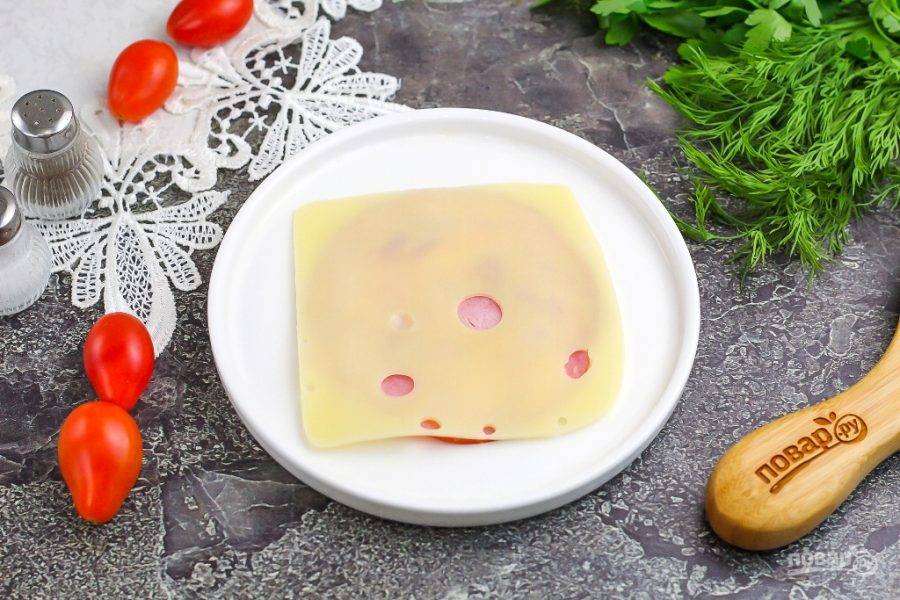 Далее накройте ветчину сырным слайсом — у меня он прямоугольный, но в продаже имеются и круглые, правда другого сорта.