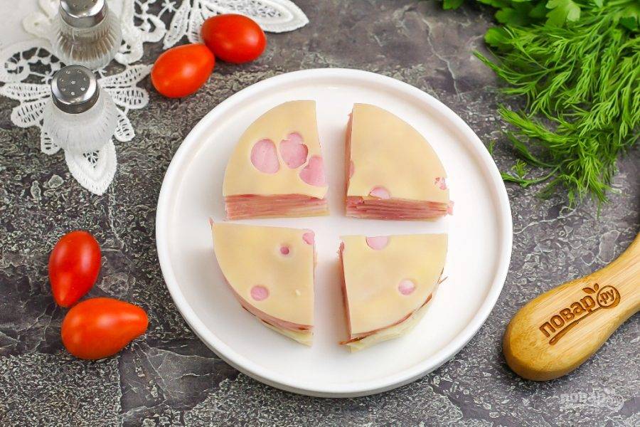 После этого аккуратно нарежьте четвертинки еще пополам, придерживая ломтики сыра и ветчины рукой, чтобы они не вылезали друг за друга. У вас получатся такие аппетитные кусочки, как будто тортики!