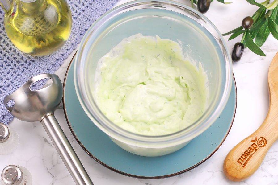 Посолите и поперчите, добавьте немного фильтрованной воды (20-30 мл.) и отпюрируйте все погружным блендером.