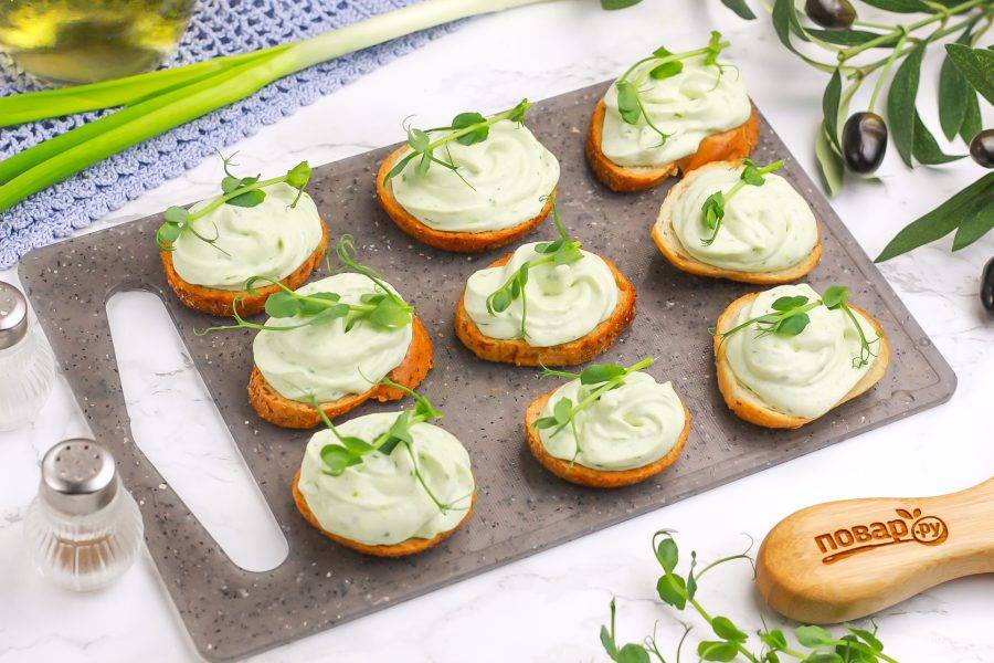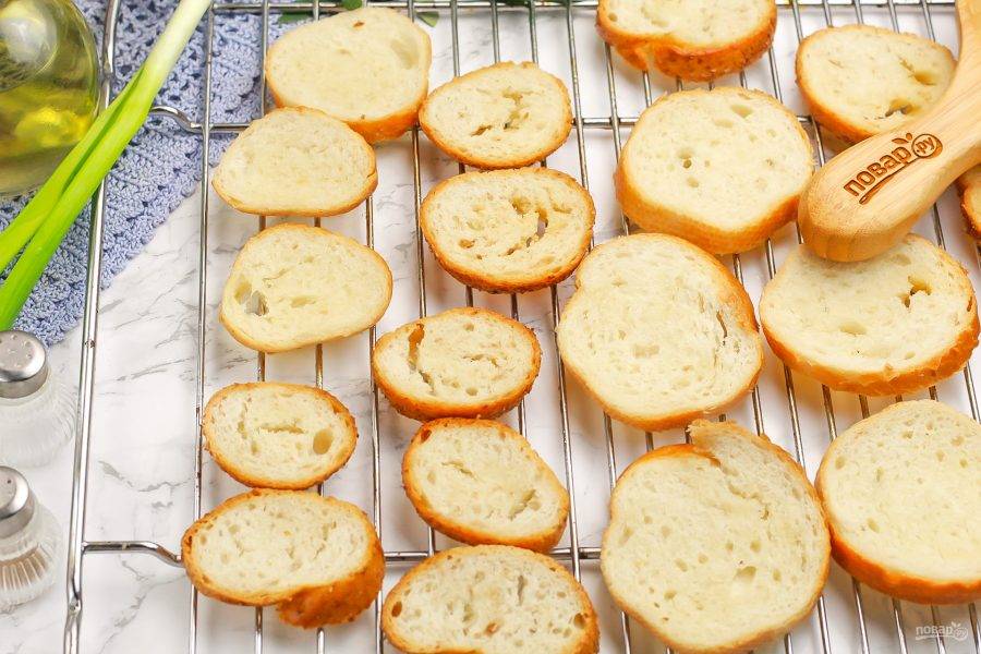 Ломтики багета подсушите в духовке или на сковороде 5 минут, сбрызнув растительным маслом.