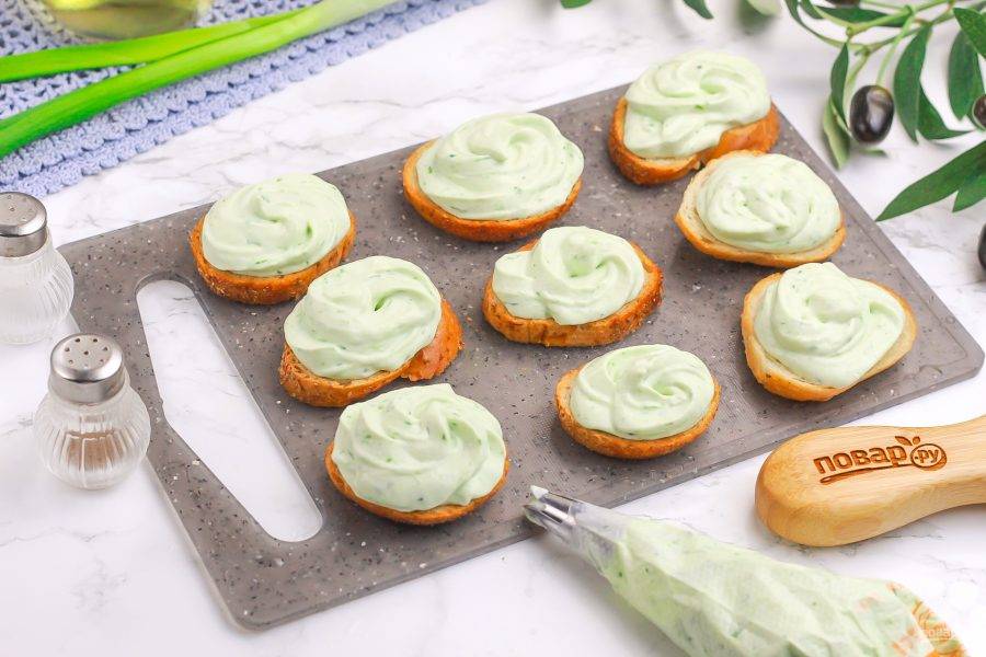 Выложите творожный крем в кулинарный пакет и отсадите на ломтики багета.