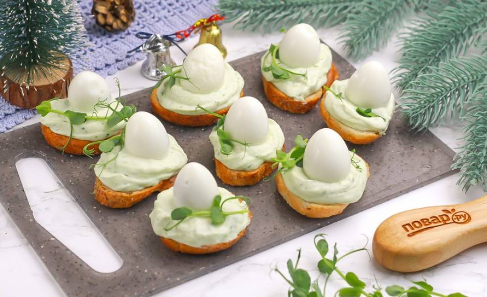 Выложите на каждый ломтик отварное перепелиное яйцо. По желанию можете украсить еще зеленью или приправами, специями.