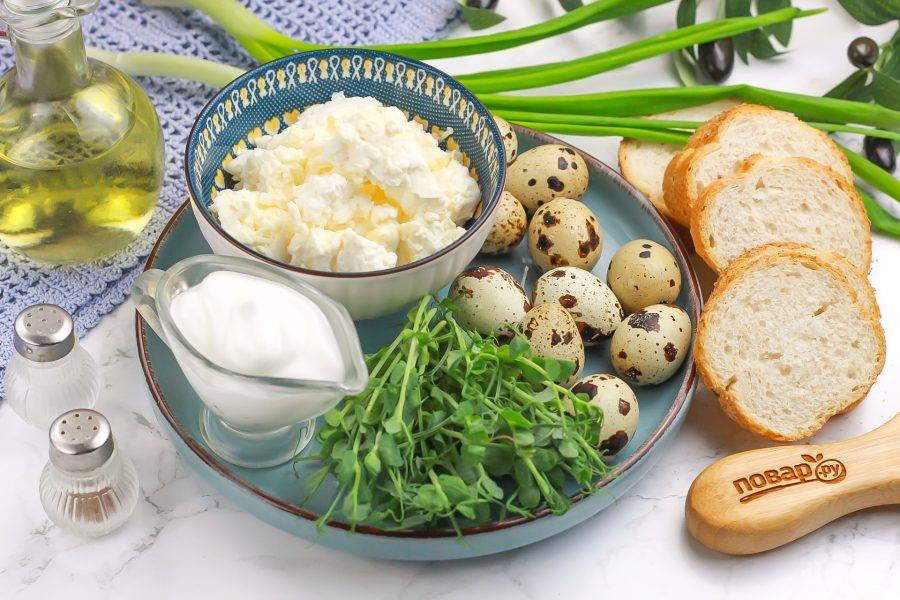 Подготовьте указанные продукты. Можно приобрести не только зеленый лук, но и укроп, петрушку, шпинат и т.д., чтобы приготовить зеленый сырный мусс. Отварите перепелиные яйца в течение 5-6 минут и остудите.