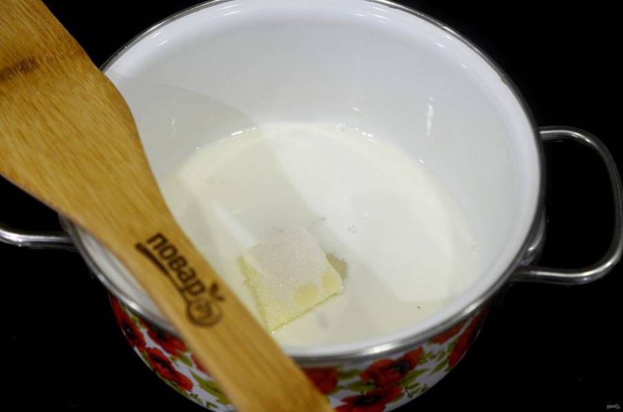 2. Молоко, сливки, ванильный сахар и половину сахара и масло доведите до кипения на плите. Снимите с огня.