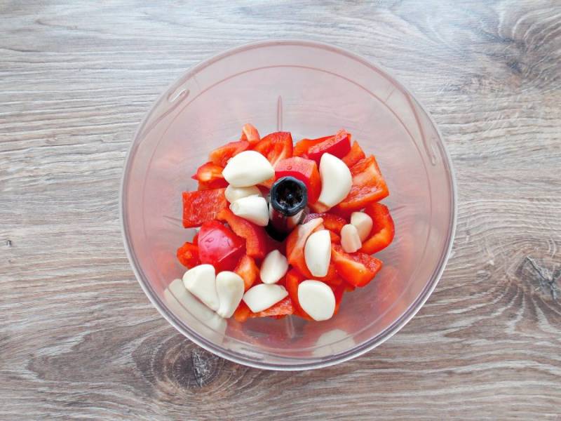 Кусочки болгарского перца выложите в чашу блендера. Чеснок очистите и добавьте к перцу.