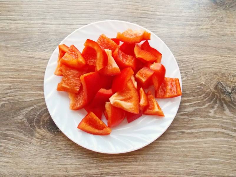 Болгарский перец вымойте, хорошенько вытрите, удалите хвостики и семена. Порежьте перец на средние дольки.