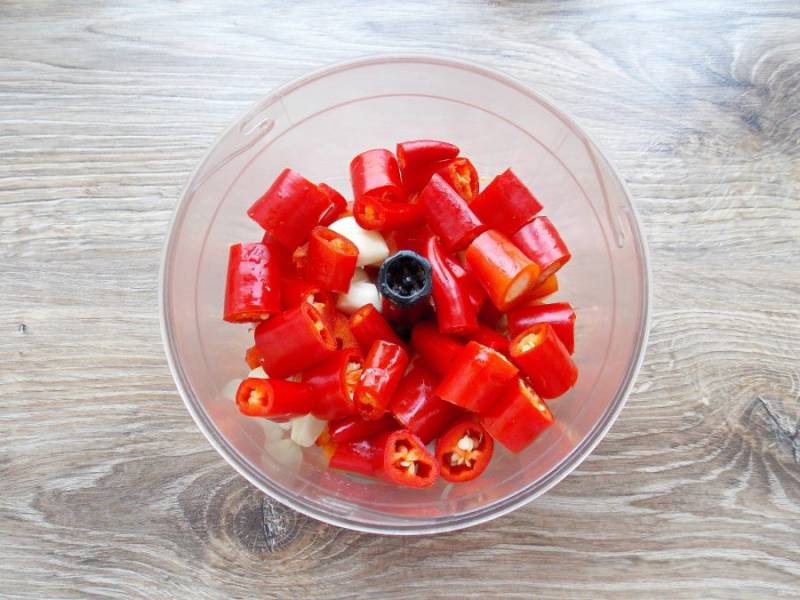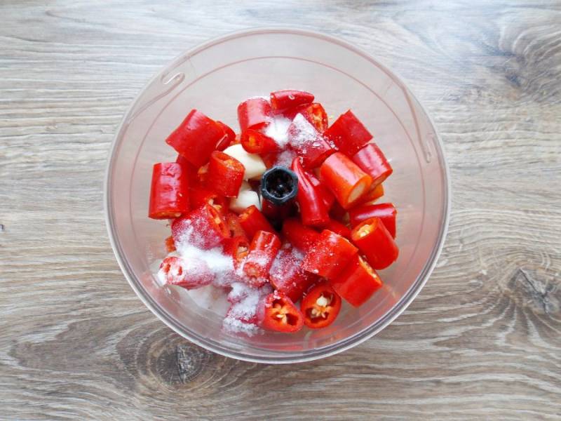 Острый перец вымойте и обсушите. Удалите хвостики и порежьте на кусочки. Добавьте их в чашу с овощами. Будьте очень осторожны и сразу хорошенько вымойте руки. Ни в коем случае не трогайте слизистую, можете получить ожог от перца.