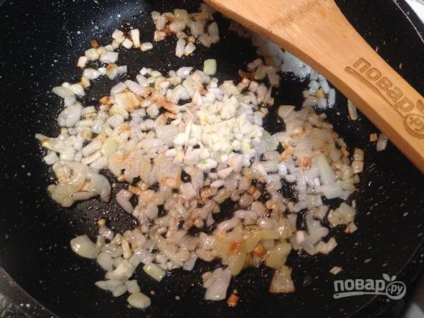 7. Приготовим соус. Обжариваем мелко нарезанный репчатый лук до легкого золотистого цвета и добавим мелко нарезанный чеснок. Обжариваем минуту-полторы.
