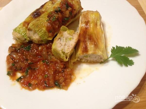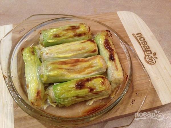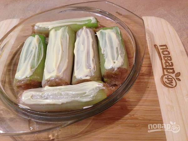 6. Заполняем трубочки из лука-порея, выкладываем в посуду для запекания, смазанную растительным маслом. И слегка смажем сметаной или майонезом. Отправляем в разогретую до 180 градусов духовку на 30-35 минут.