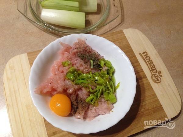 5. Подготовим начинку: смешаем куриный фарш, яйцо, обжаренный лук. По вкусу солим, перчим и добавим сушеный базилик.
