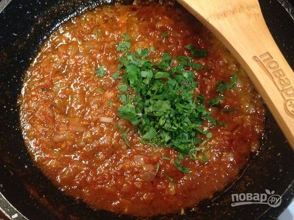 9. Когда лишняя жидкость выпарилась, доводим соус до вкуса, добавив соль, молотый перец и можно добавить щепотку сахара. И теперь добавим мелко нарезанную зелень, перемешиваем и убираем с огня.