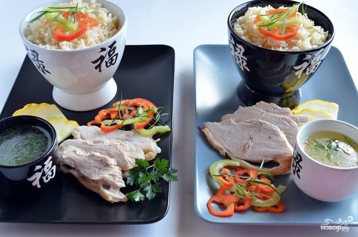 Готовый рис разложите по тарелкам. Добавьте к нему нарезанную индюшку и бульон в отдельной миске, по желанию украсьте перцем и зеленью. Приятного аппетита!