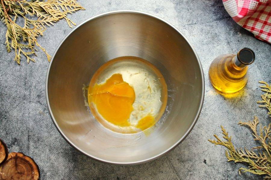 В миску разбейте яйцо, перемешайте и отмерьте нужное количество. Влейте растительное масло.