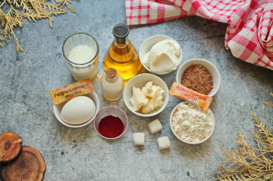 Подготовьте все необходимые ингредиенты для приготовления капкейков "Красный бархат".