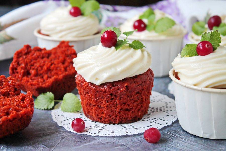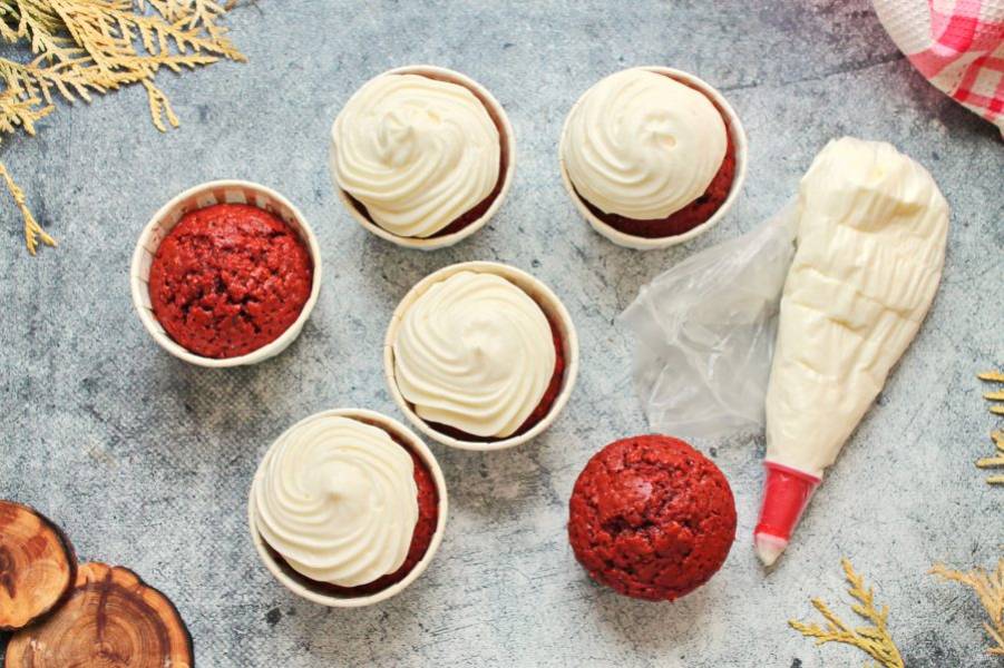 Готовый крем переложите в корнетик с насадкой и сделайте шапочки поверх капкейков "Красный бархат".