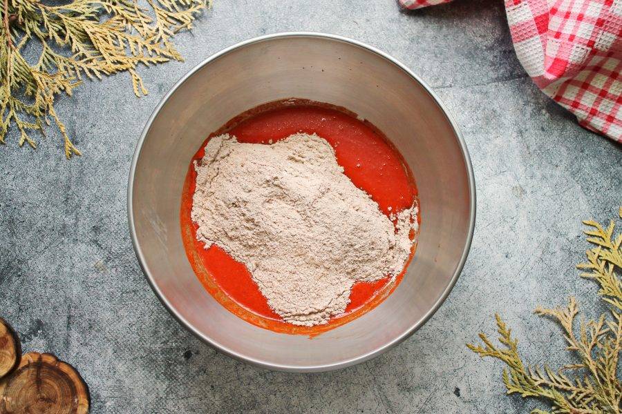 Смешайте муку, сахар, разрыхлитель, ванильный сахар и какао. Добавьте все в жидкую часть и тщательно перемешайте до однородности. Тесто получается немного рыхлым, но это нормально.