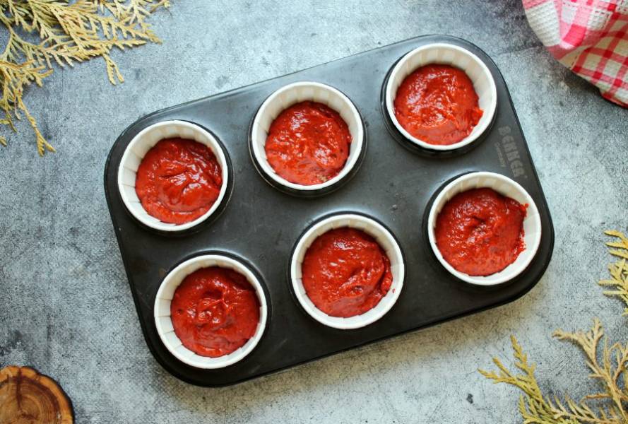 Разложите тесто в бумажные формочки для капкейков на 2/3 высоты.