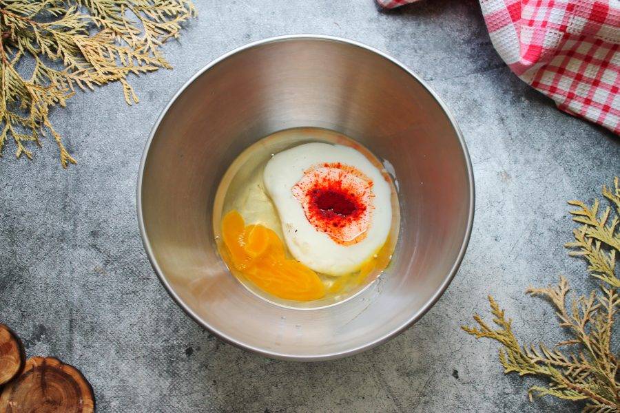 Влейте кефир, добавьте пищевой краситель и тщательно перемешайте все до однородности.